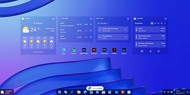 - نوار وظیفه شناور: یکی از تغییرات جالب در ویندوز 12، نوار وظیفه شناور آن است. این نوار وظیفه قابلیت نمایش برخی از وظایف سیستمی را داراست و ویجتهای جدیدی را به کاربران ارائه میدهد. از این رو امکان دسترسی به اطلاعات مهم و امکانات پرکاربرد تسهیل شده است. همانطور که در ویندوز 11 به وضوح مشخص بود، مایکروسافت اولویت خود رابر سادگی و در دسترس بودن امکانات پر استفاده ویندوز قرار داده است. به این معنا که نرمافزارها و امکانات پر استفاده و مهم در دسترس هستند و سایر قابلیتها در زیر منوها پنهان شدهاند. ویندوز 12، با پیشنمایشهای اولیهای که از آن ارائه شده، ما را به تغییرات کلی و جذاب امیدوار کرده است. بنابراین مایکروسافت با اعمال تغییرات در رابطکاربری، نوار وظیفه، منوی استارت، ویجتها و افزودن امکانات جدید، قصد دارد ویندوز 12 را به یک تجربهی متفاوت و بهتر تبدیل کند.